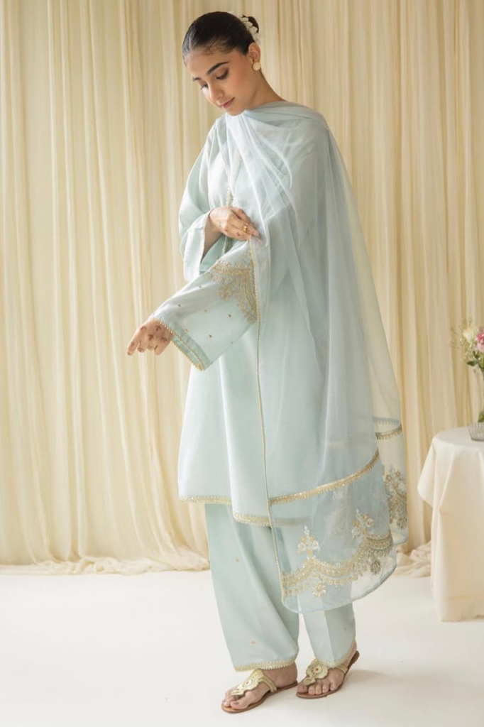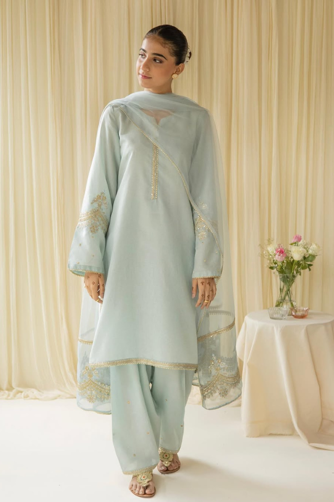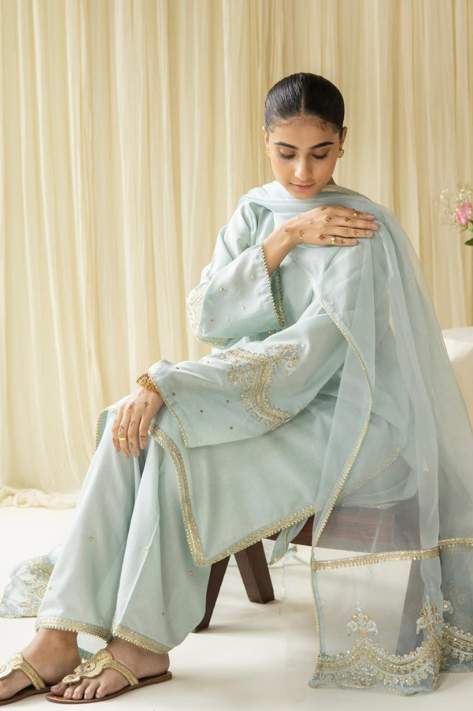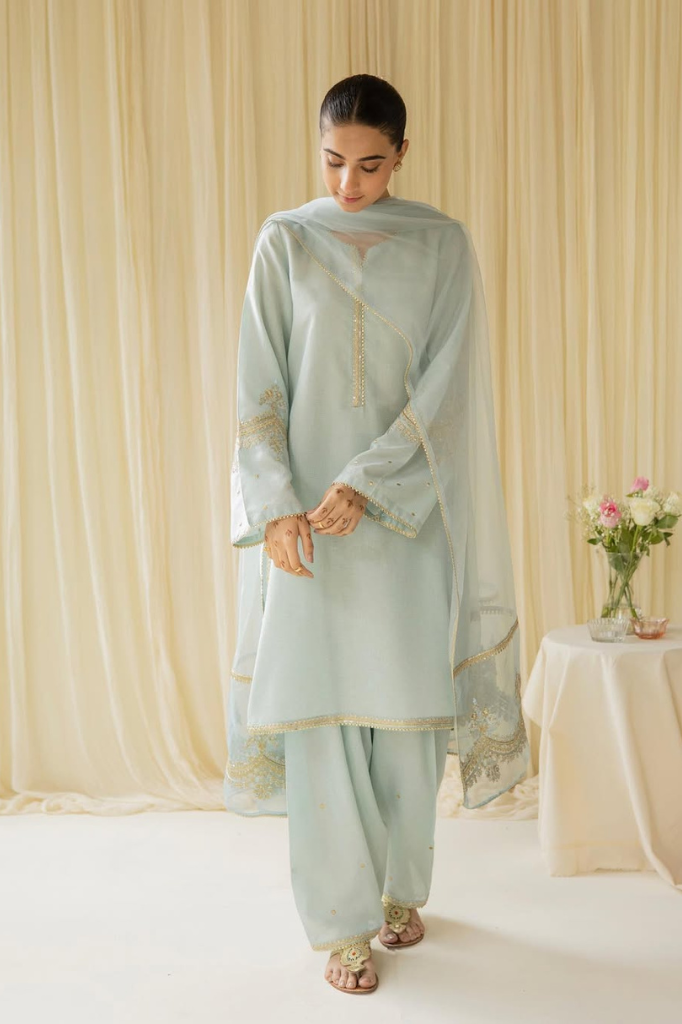 Aqua Bloom – A stunning 3-piece Lawn suit in a refreshing mint-aqua hue, adorned with delicate golden embroidery for an elegant and sophisticated look. Paired with a matching satin trouser and a sheer organza dupatta featuring intricate golden embellishments and lacework, this ensemble is perfect for festive and formal occasions. Lightweight, breathable, and luxurious, it's designed for effortless grace and comfort.