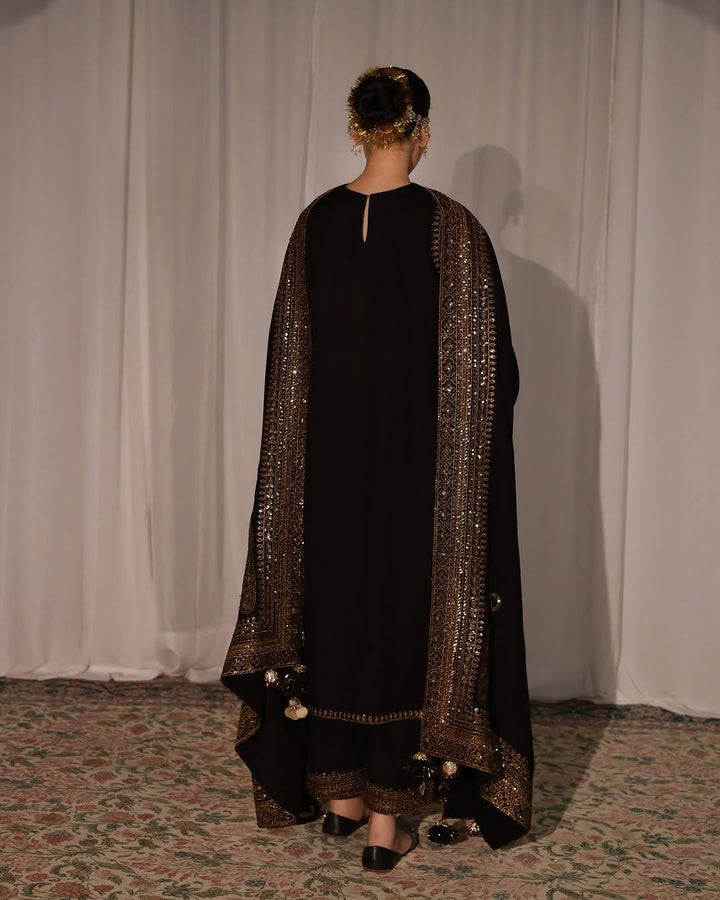 The Full Sleeves long shirt is a masterpiece of timeless design, adorned with intricate golden embroidery along the hem and neckline, creating a stunning contrast against the rich black fabric. The straight trousers are tailored to perfection, with delicate embellishments that harmonize beautifully with the ensemble.