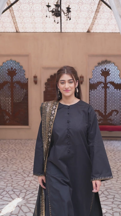 Unveil the allure of elegance with Rani - Black Mystique, a 3-piece suit designed for women who embrace sophistication and charm. This exquisite ensemble in luxurious black Lawn exudes a captivating mystique, perfect for evening soirées, formal events, or festive celebrations.