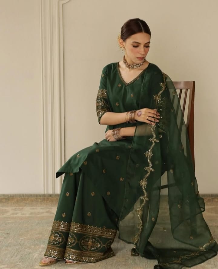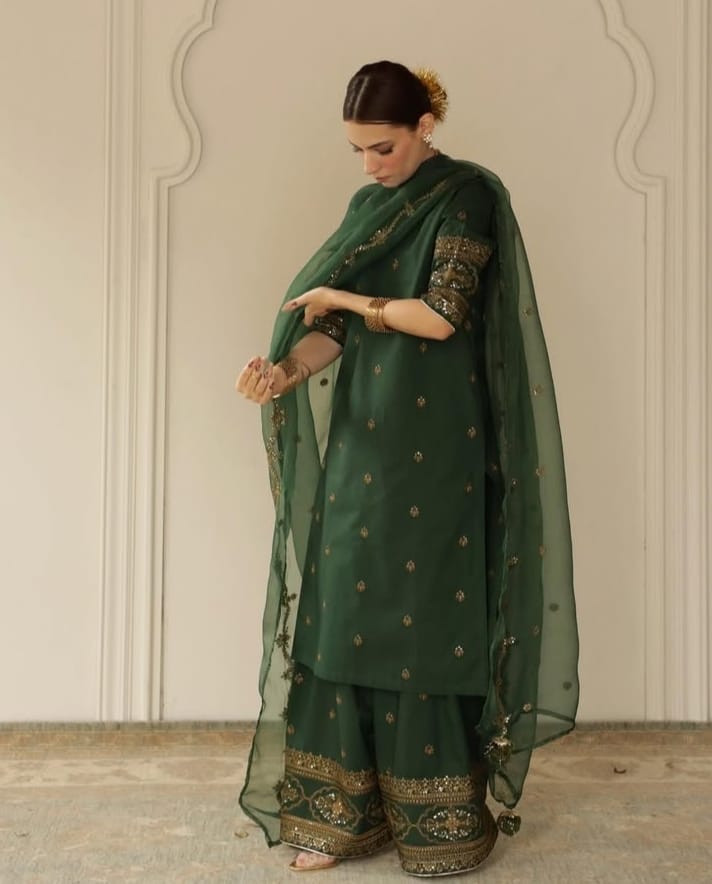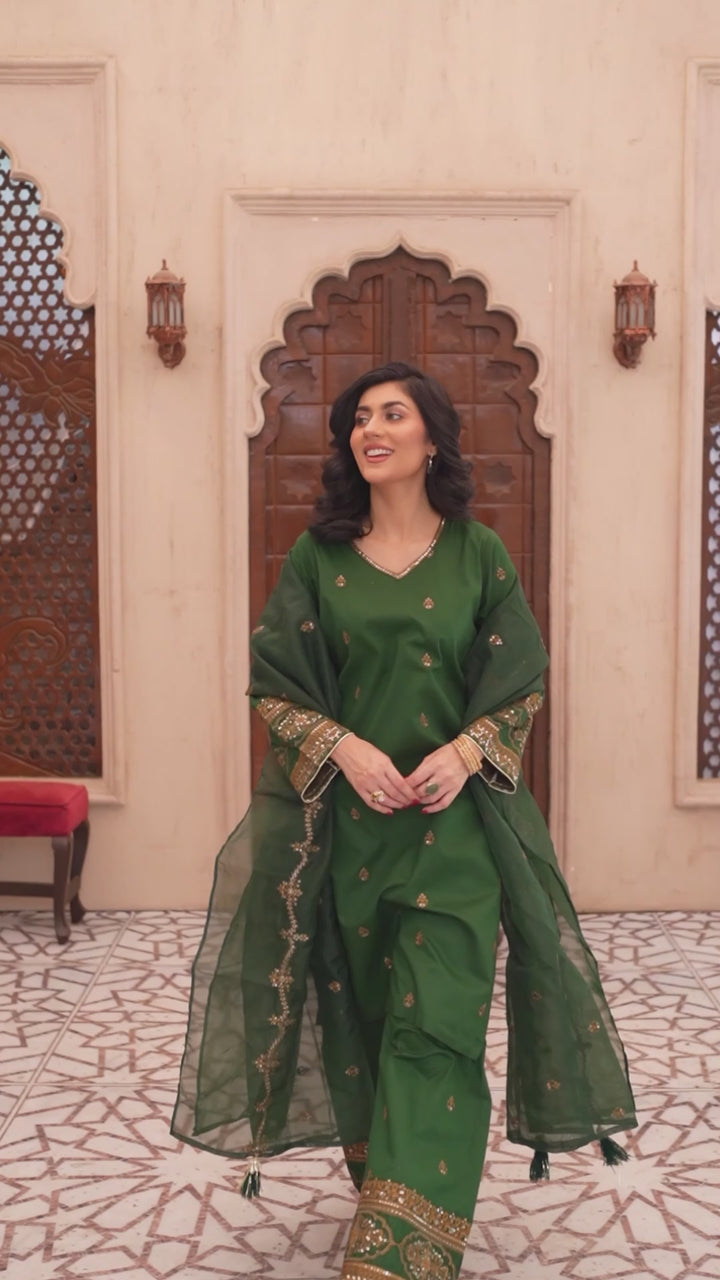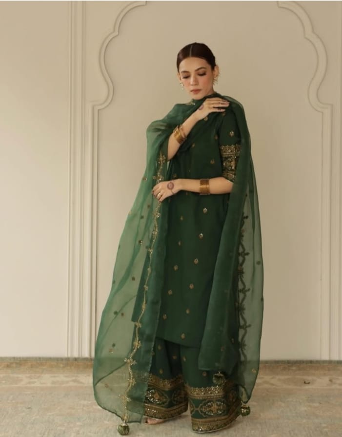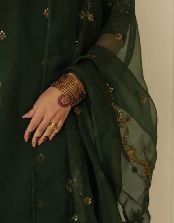 Complementing the rich deep green fabric, the outfit is paired with a delicate organza dupatta, enhancing its graceful charm. The sheer elegance of organza, combined with finely detailed embroidery, creates a sophisticated look that is both regal and effortlessly stylish.