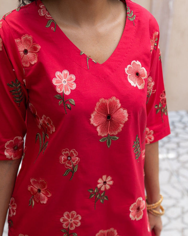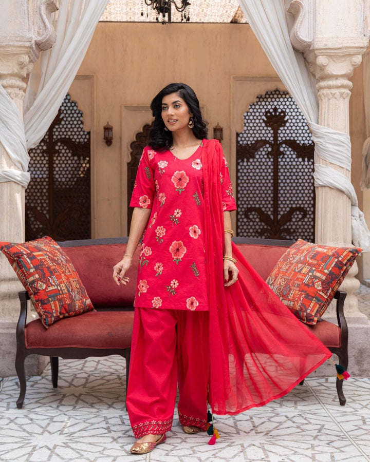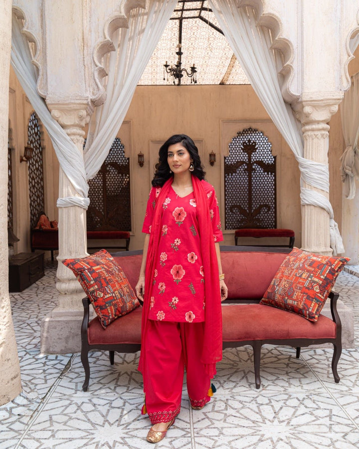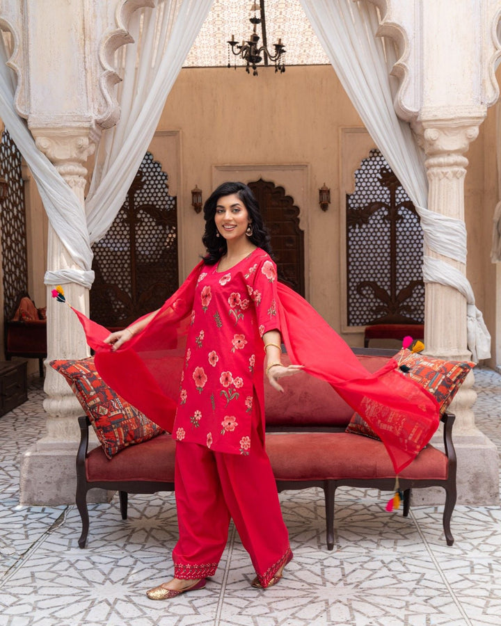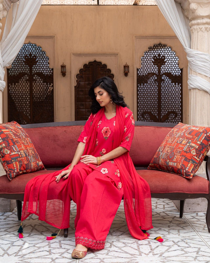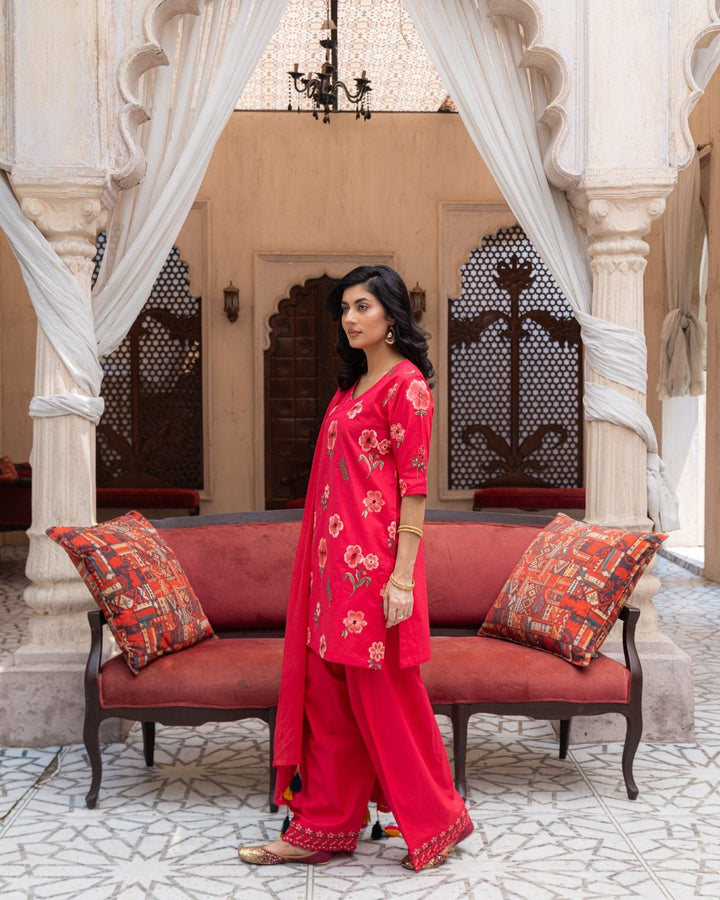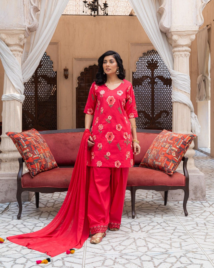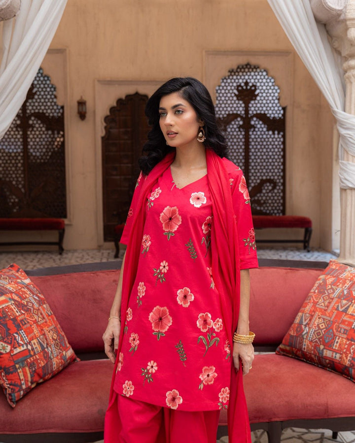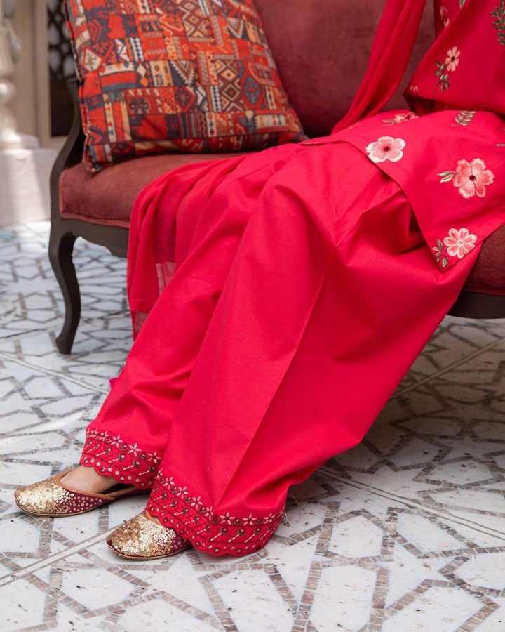 Ranisa - Gulaabo is a radiant 3-piece stitched ensemble in a rich ruby shoking pink, beautifully adorned with intricate red and green floral embroidery that echoes the charm of spring gardens. The kurta’s straight cut is paired with relaxed FARSHI SHALWAR detailed with classic threadwork and a breezy chiffon dupatta finished with vibrant tassels, adding a playful yet elegant touch. Ideal for daytime gatherings, festive brunches, or summer soirées, this outfit brings joy to every moment with its graceful color palette and timeless desi flair.