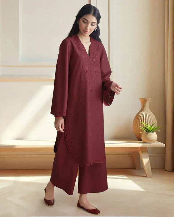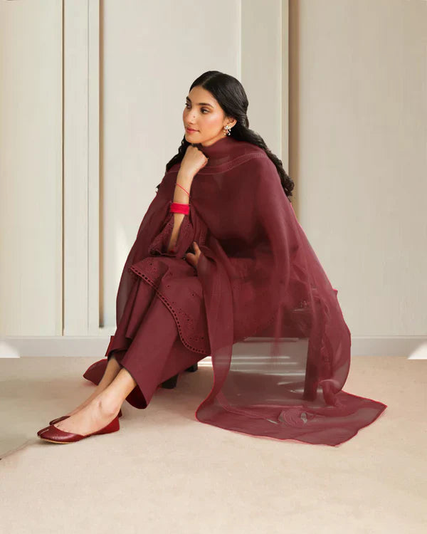A graceful Mehar Bano - Maroon Elegance-toned 3-piece stitched suit that embodies understated luxury. Mehar Bano - MAROON ELEGANCE features delicate cutwork embroidery on the neckline, sleeves, and hem, paired with a matching wide-leg trouser and a soft, CHIFFON coordinated dupatta. Crafted for the modern woman who cherishes tradition with a contemporary touch — perfect for intimate gatherings, festive moments, or elegant daily wear.