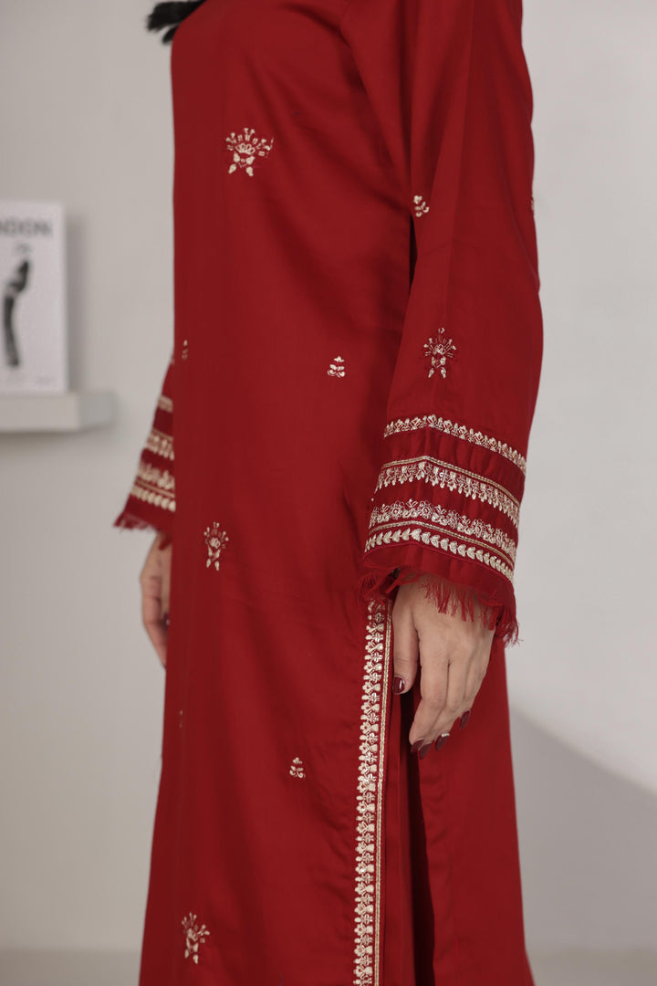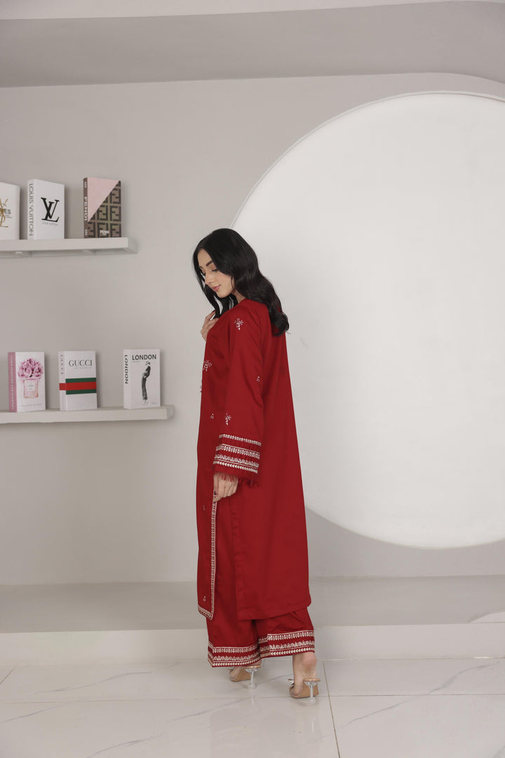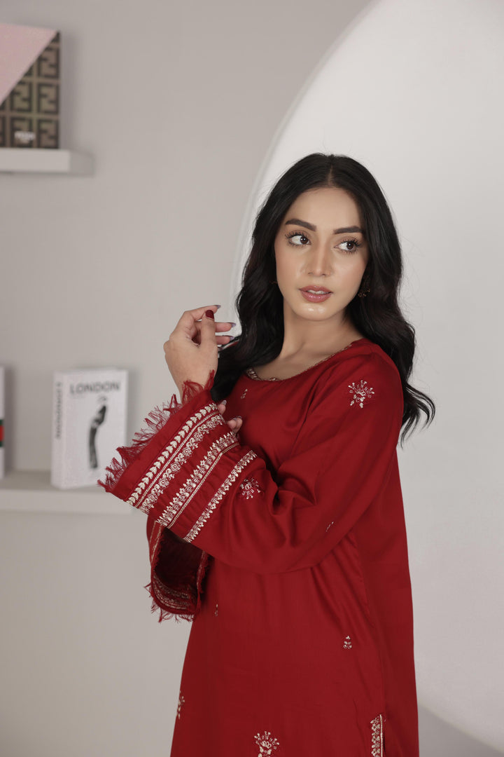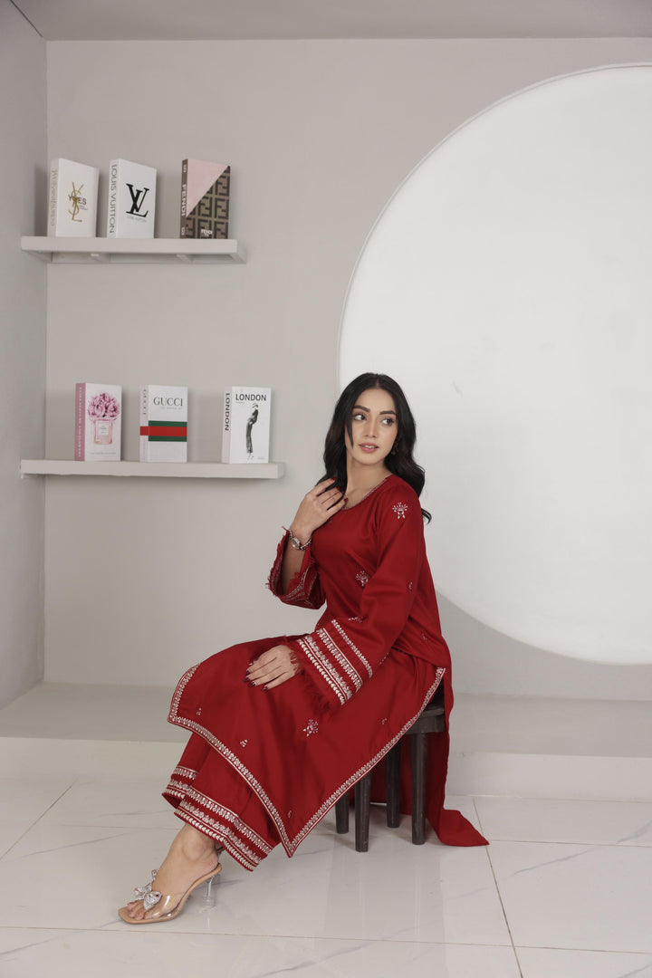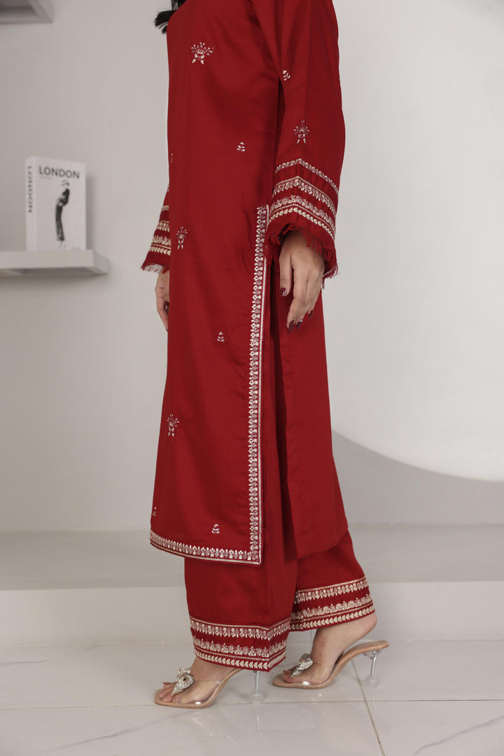 Elevate your wardrobe with Mohagany, an exquisite 2-piece suit crafted from premium satin fabric. This luxurious ensemble in a captivating deep red hue embodies grace and sophistication, making it a perfect choice for formal events and festive occasions.
