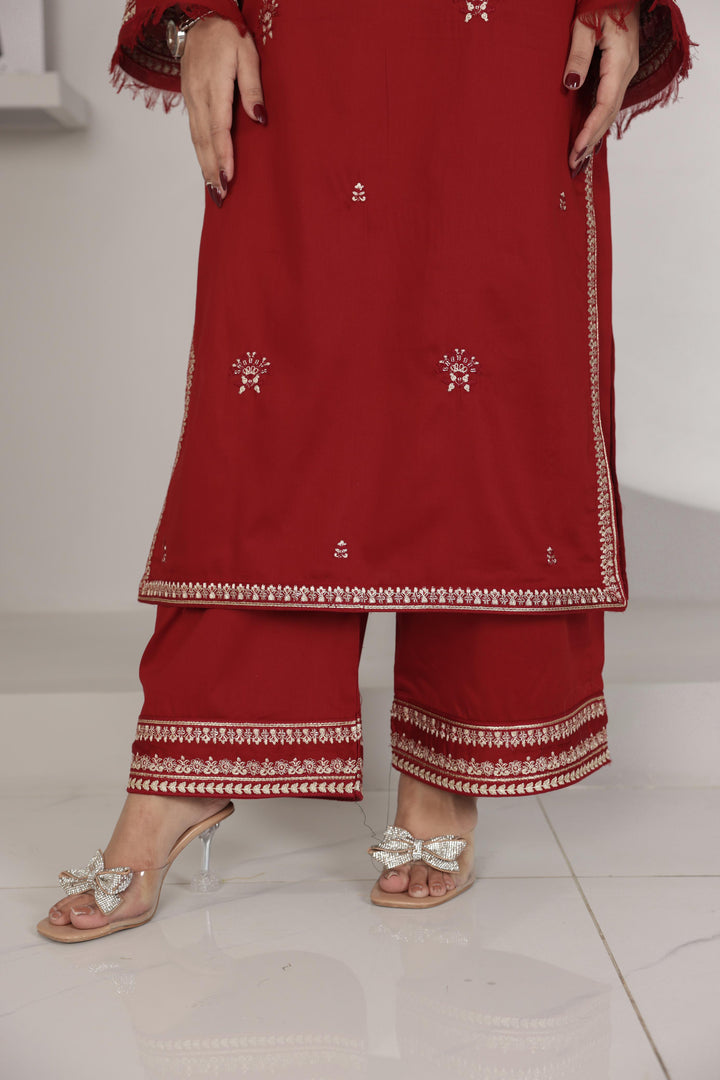- Top: A beautifully tailored straight kurta featuring intricate embroidery on the neckline, sleeves, and hemline. The refined detailing adds a touch of opulence to the design.