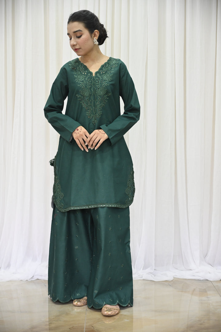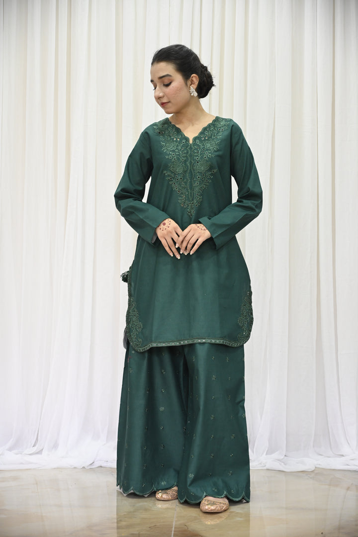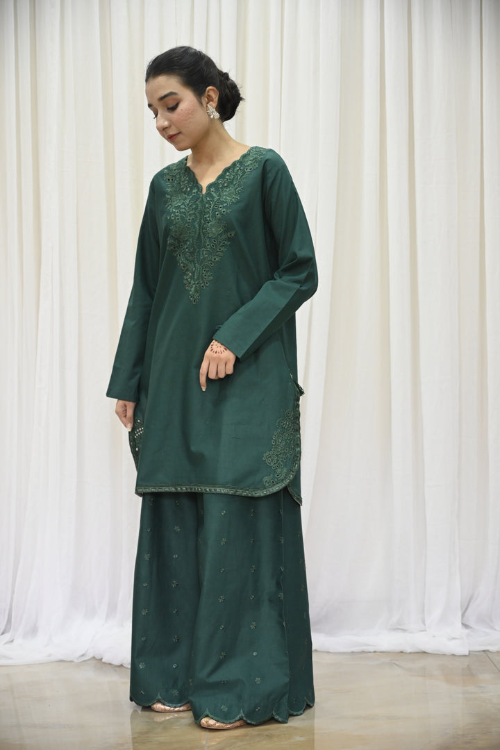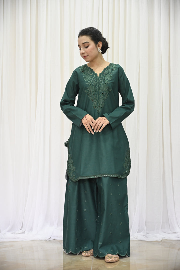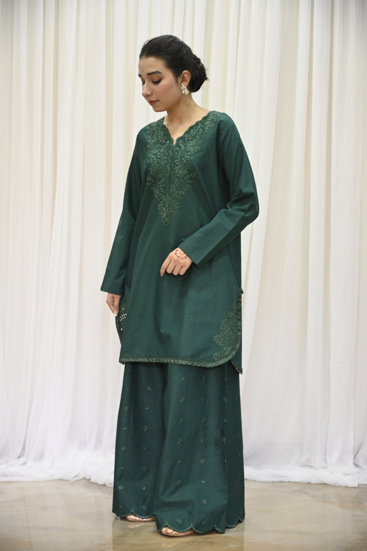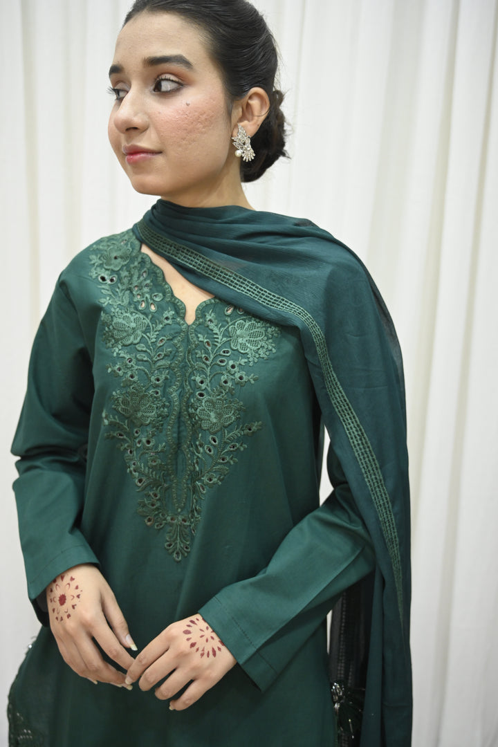 The shirt is crafted from deep emerald green lawn fabric, beautifully adorned with tone-on-tone embroidery across the front and sleeves. The elegant detailing features floral-inspired patterns, finished with an embroidered daman and subtle lace accents, adding layers of texture and refinement. The neckline is tastefully enhanced with a fabric-made button placket, framed by a fine stitched lace that draws the eye with its simplicity.