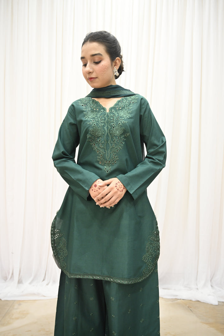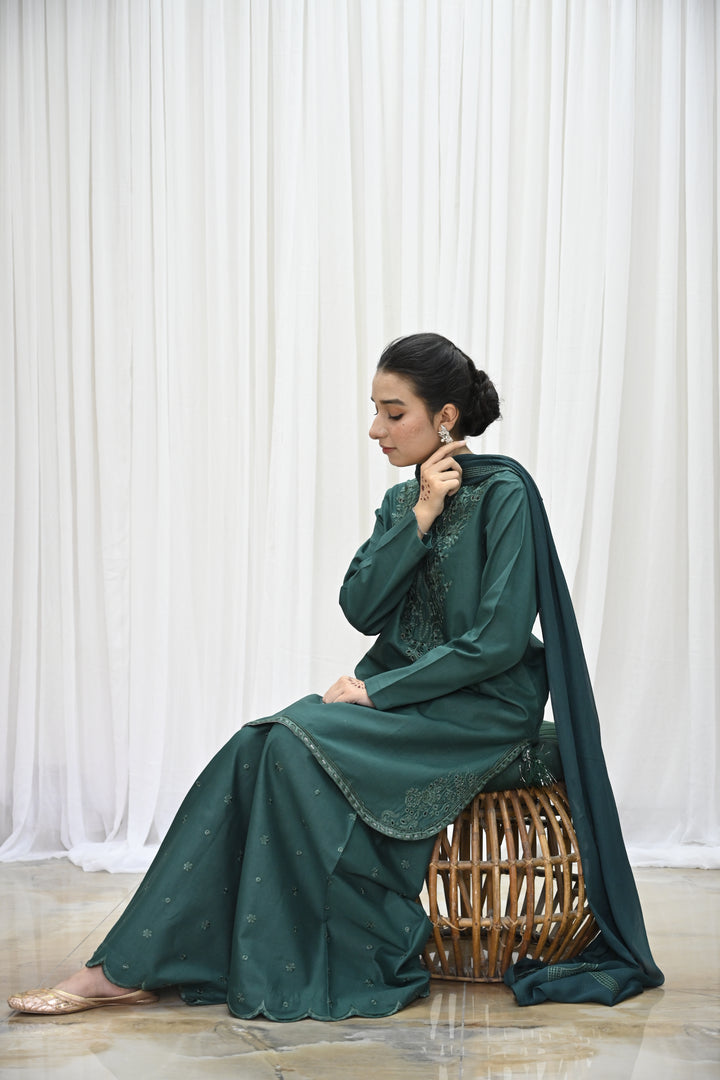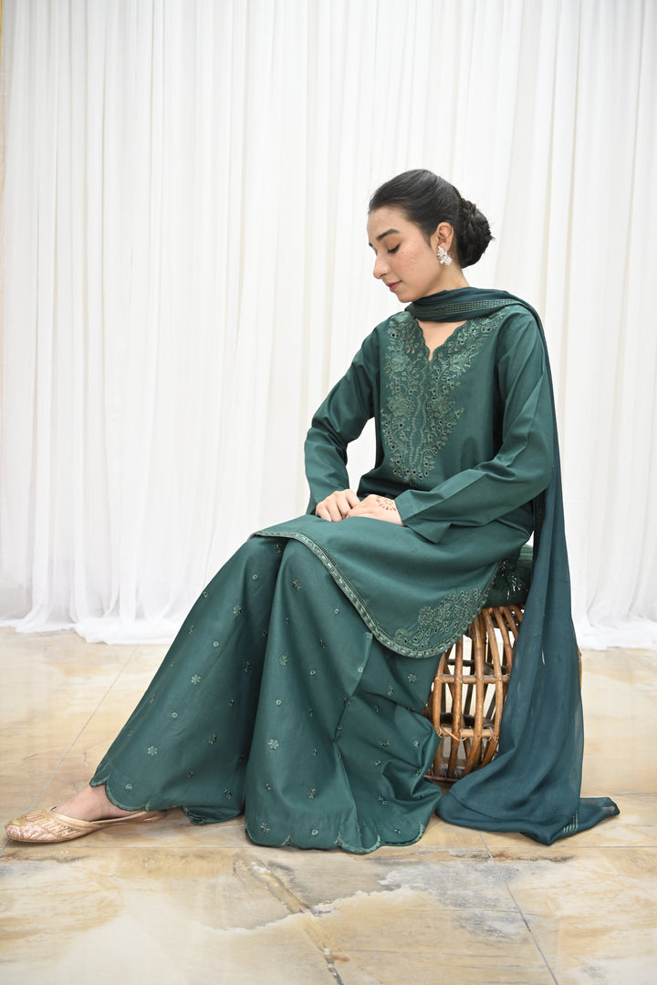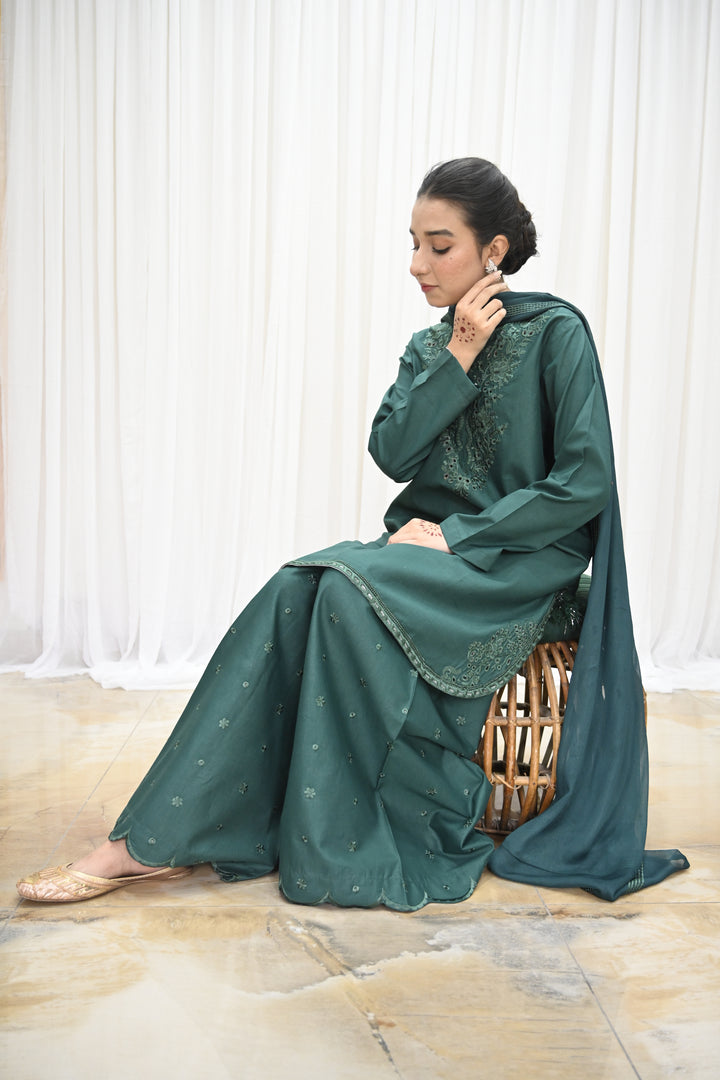 Embodying grace and sophistication, Noor Bano - Green Elegance is a 3-piece stitched suit designed for timeless charm and elevated style.