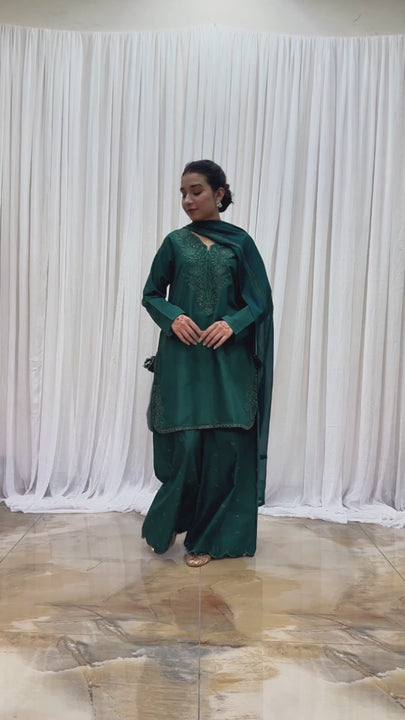To complete the look, the chiffon dupatta is dyed in rich green tones, soft and fluid, adding movement and grace without overpowering the minimal elegance of the design.