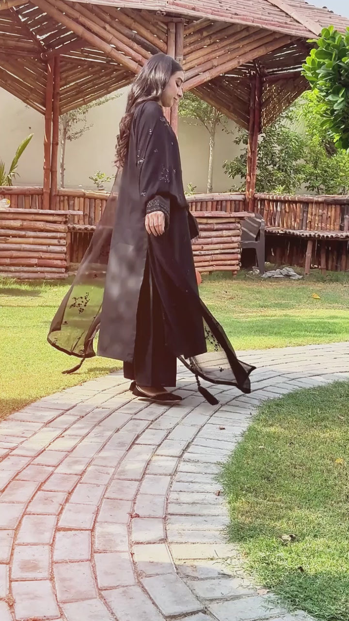Elevate your festive wardrobe with Sahiba Shab e Noor, a timeless 3-piece stitched ensemble that redefines sophistication in black. Perfectly crafted for those who appreciate subtle glamour, this outfit features a flowing long shirt, straight trousers, and a coordinating dupatta — all curated to bring a graceful charm to your festive looks.