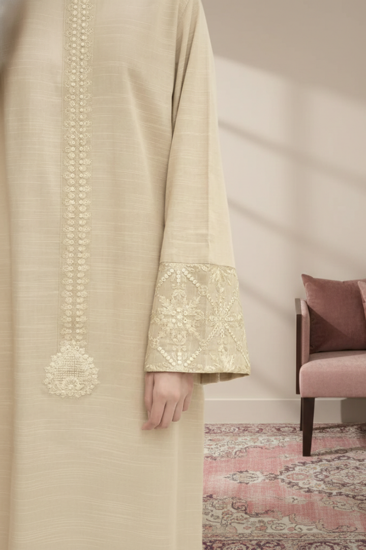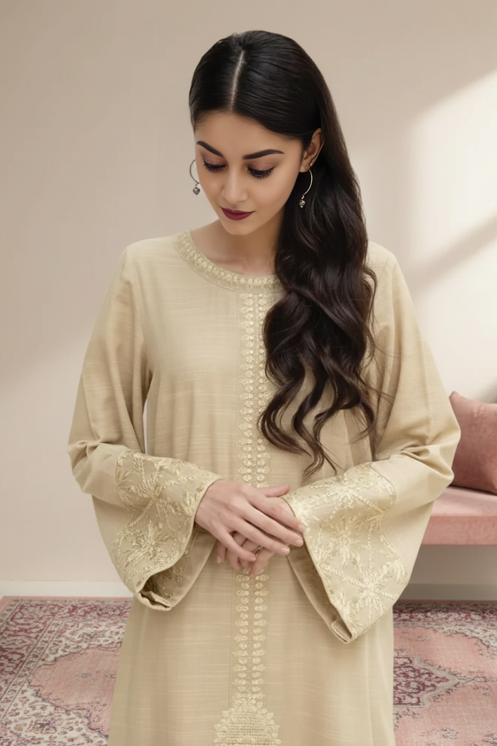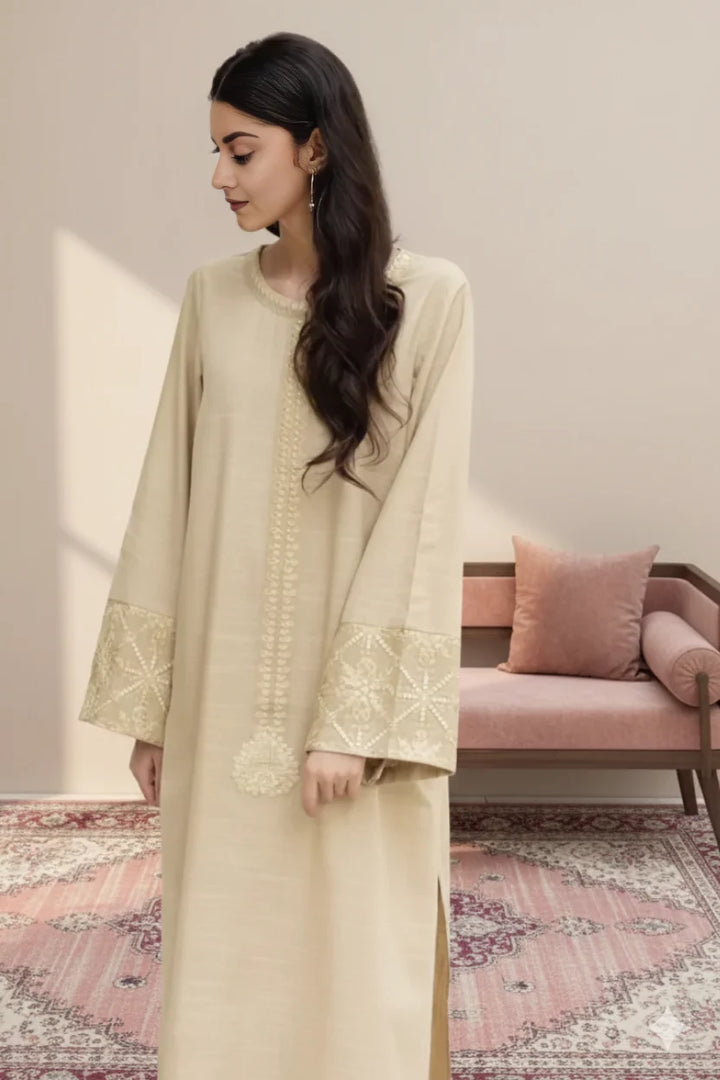The premium khaddar fabric provides warmth and durability, making it an ideal choice for cooler seasons while maintaining a graceful, timeless look. Designed with a classic silhouette, Sandstone is perfect for daytime gatherings, office wear, or semi-formal winter occasions where you want to make a poised, effortless statement.