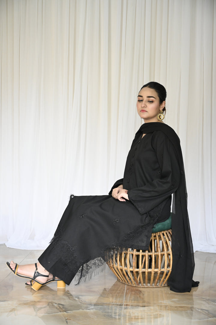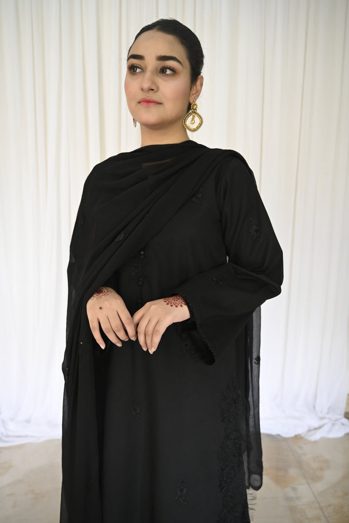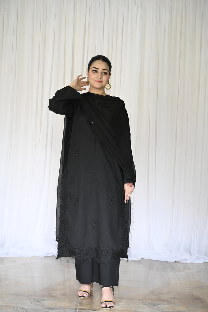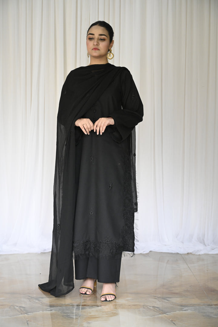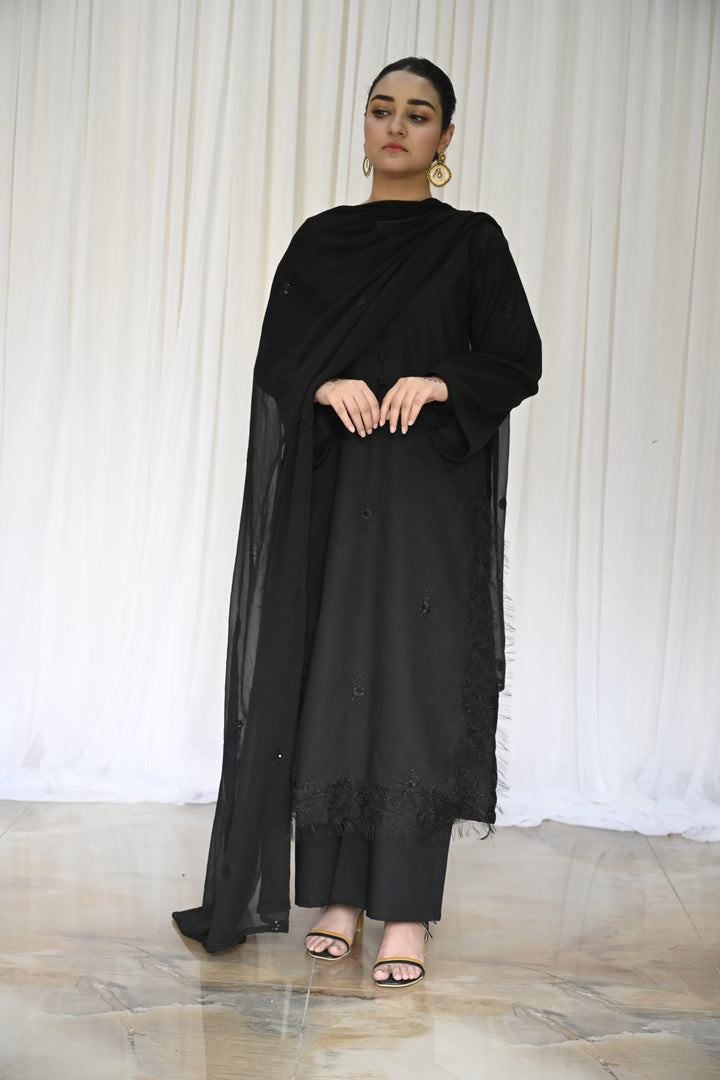 Completing the ensemble is a digitally embroidered chiffon dupatta in soft abstract black hues. Light, fluid, and graceful it adds movement and poetic balance to the strong foundation of black.