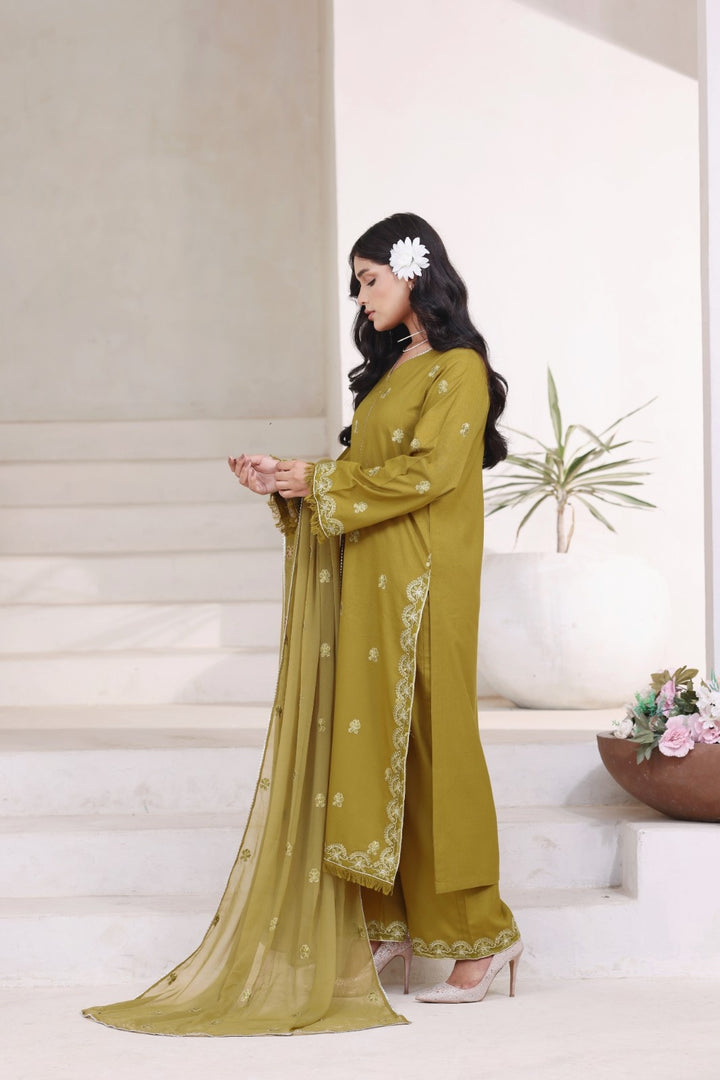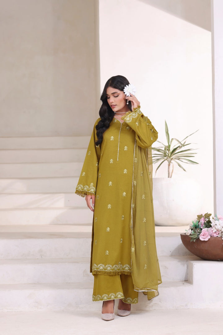 Shanaya-Olive Blossom – Embroidered Dhanak 3-PieceElevate your style with Shanaya-Olive Blossom,