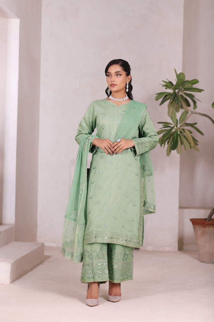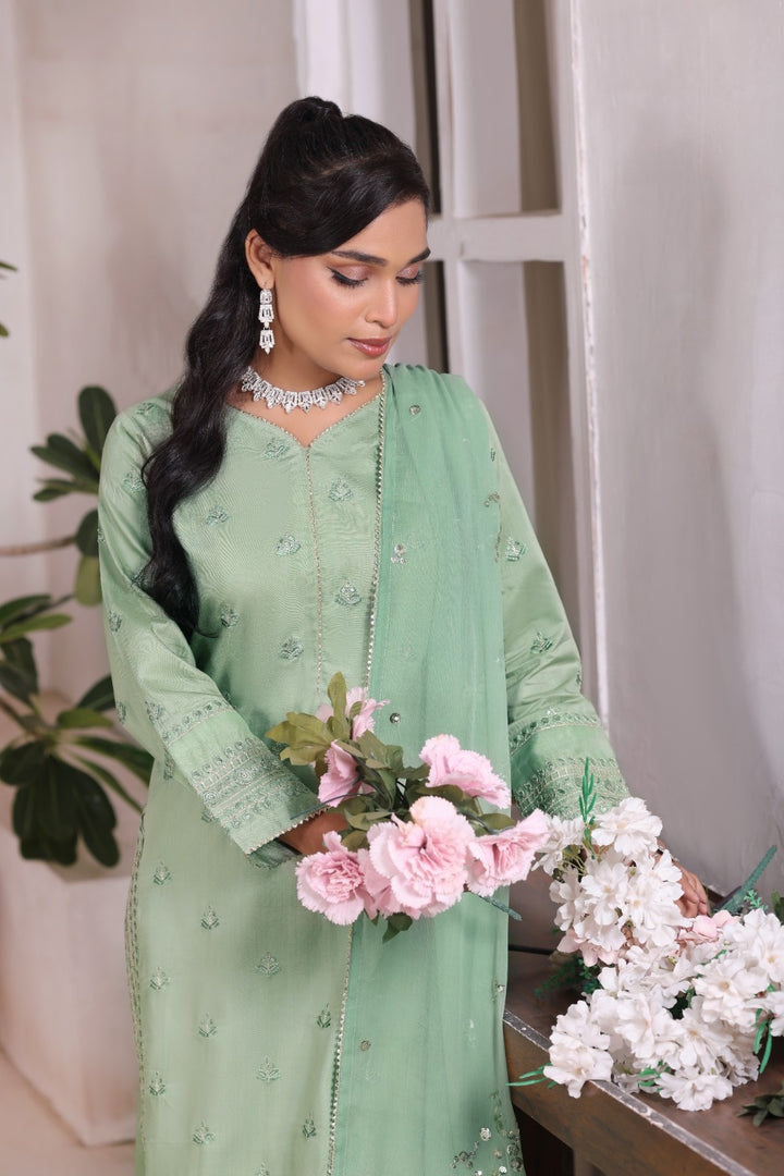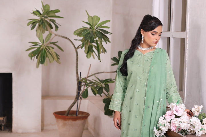 Sheenora-Mint Vintage, a pastel-toned embroidered suit that blends elegance with comfort. Crafted from premium breathable fabric, this 3-piece outfit features a straight, long shirt with intricate embroidery on the front and sleeves, paired with matching trousers and a lightweight chiffon dupatta adorned with subtle embellishments.