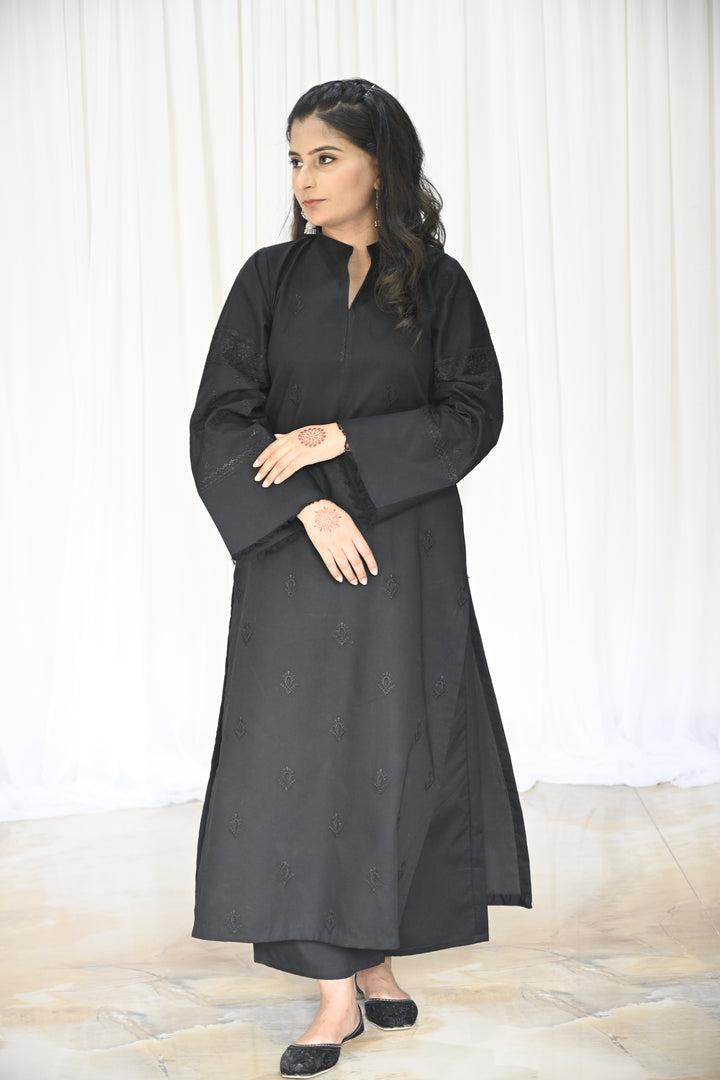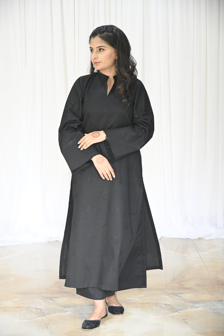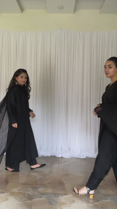 Whether it’s a refined evening event, a festive dinner, or Muharram nights out, Zahra - Black Ember, speaks volumes in quiet tones. Its all-black color palette is both bold and versatile, making it a forever piece in your wardrobe.