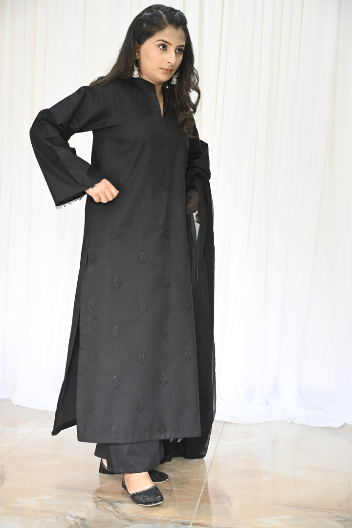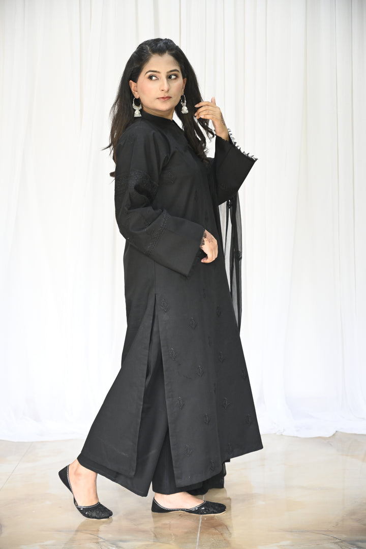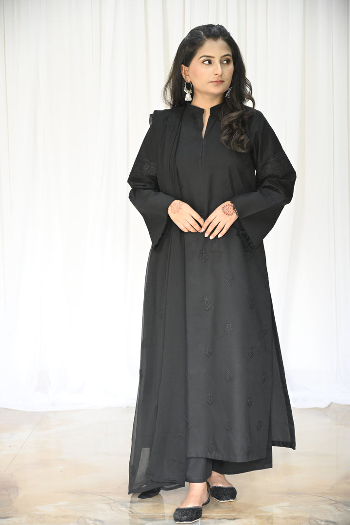 Step into a realm of quiet luxury with Zahra - Black Ember, a 3-piece stitched ensemble that blends depth, elegance, and timeless appeal.