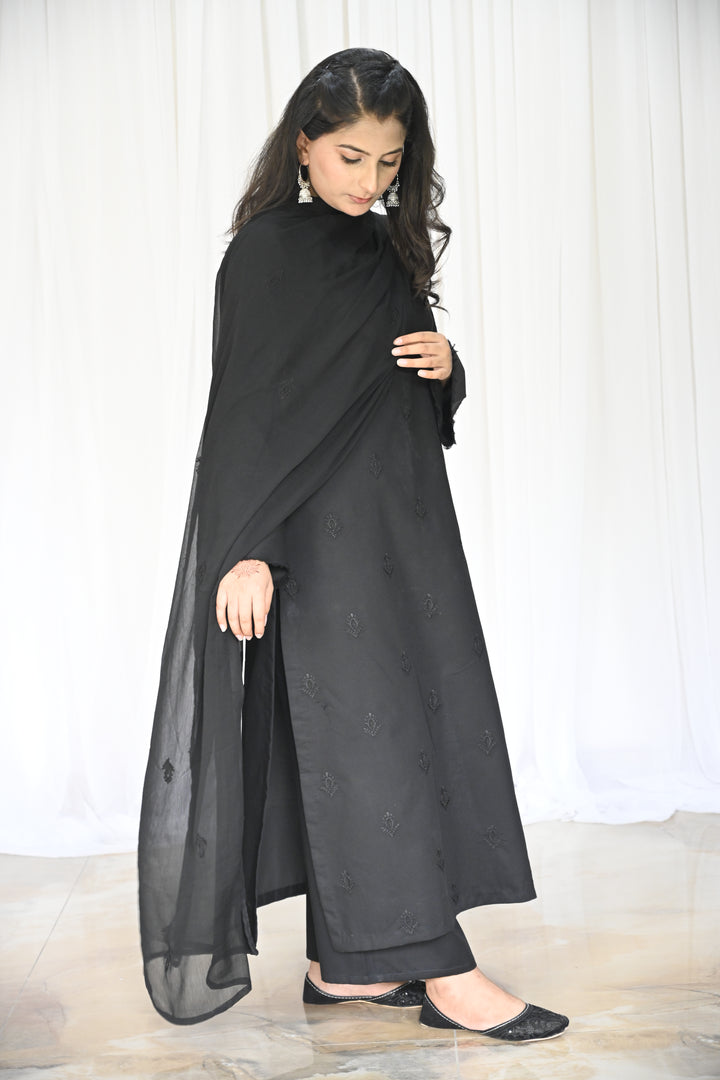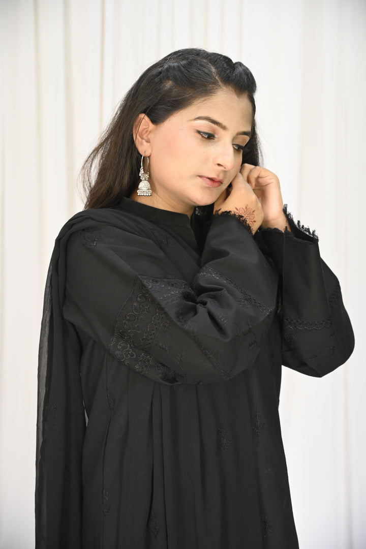 Completing the ensemble is a digitally embroidered chiffon dupatta in soft abstract black hues. Light, fluid, and graceful it adds movement and poetic balance to the strong foundation of black.