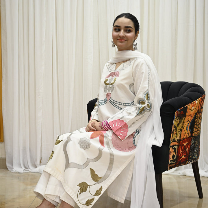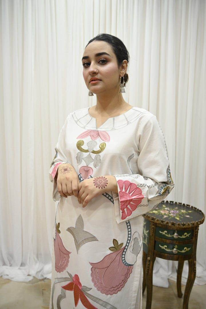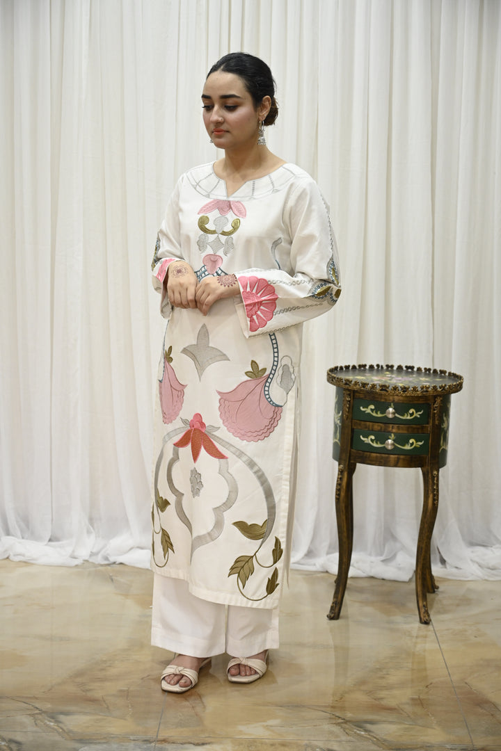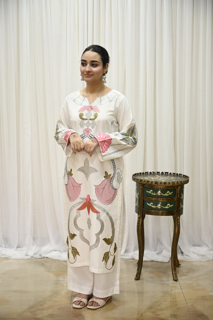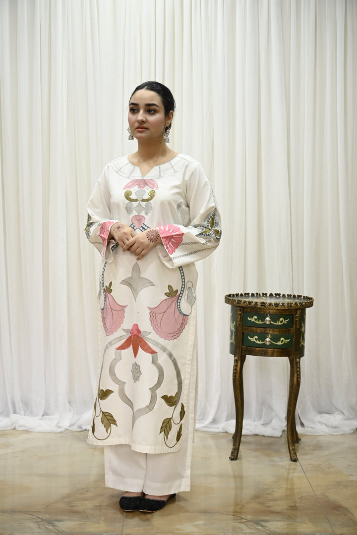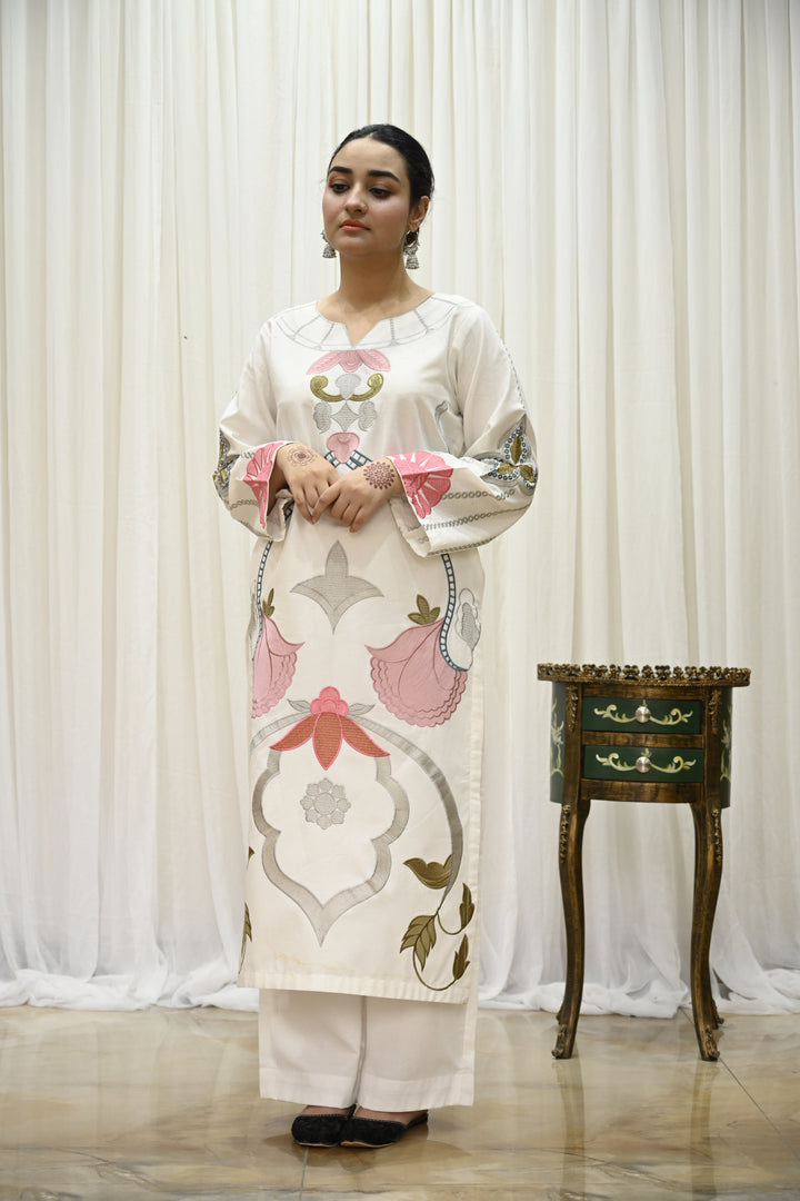 Crafted on a smooth ivory base, this outfit features delicate embroidered patterns in shades of pink, olive, grey, and soft gold. The designs are inspired by nature — soft petals, flowing vines, and subtle textures that add just the right amount of detail without overpowering the look. It’s stitched in a classic straight cut that falls beautifully, giving it a relaxed yet refined feel.