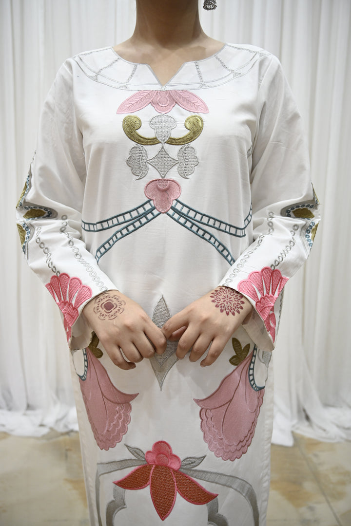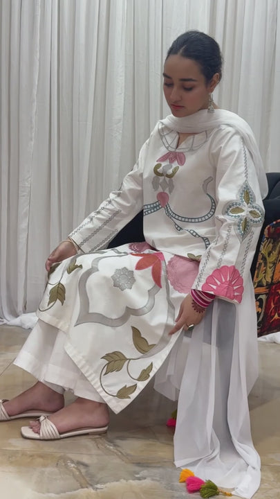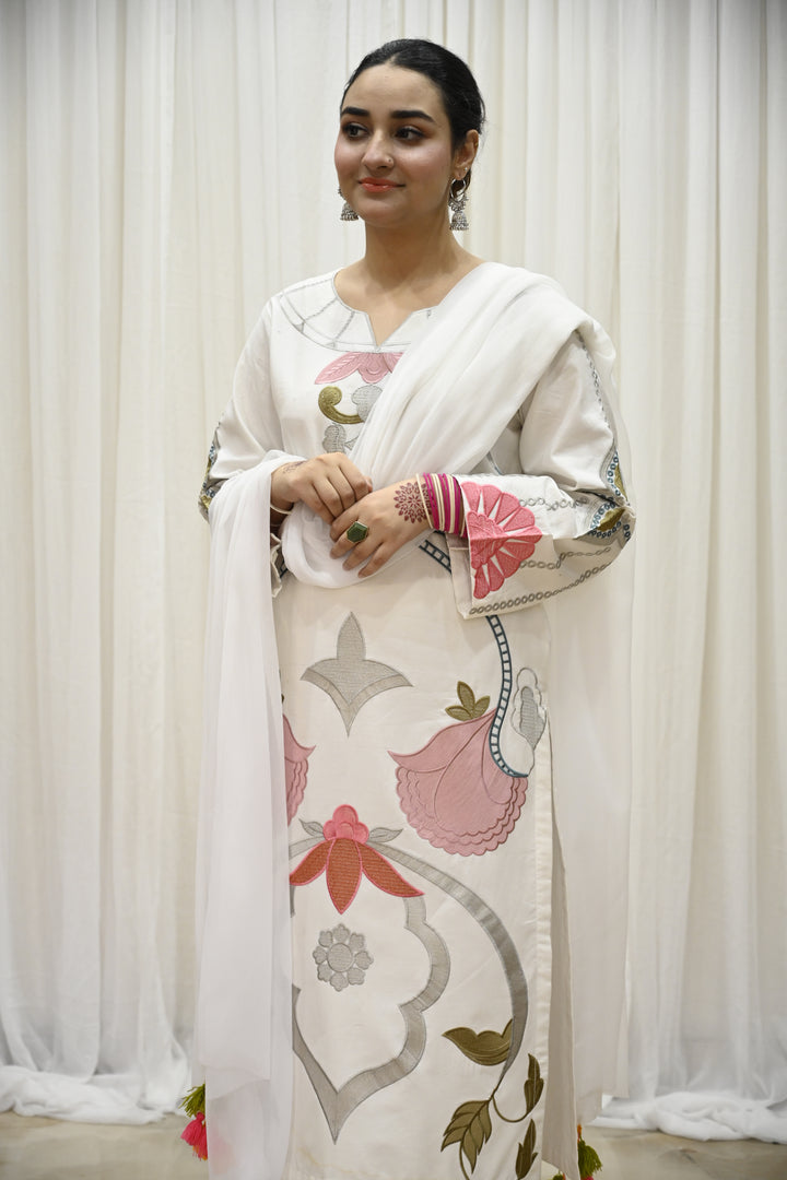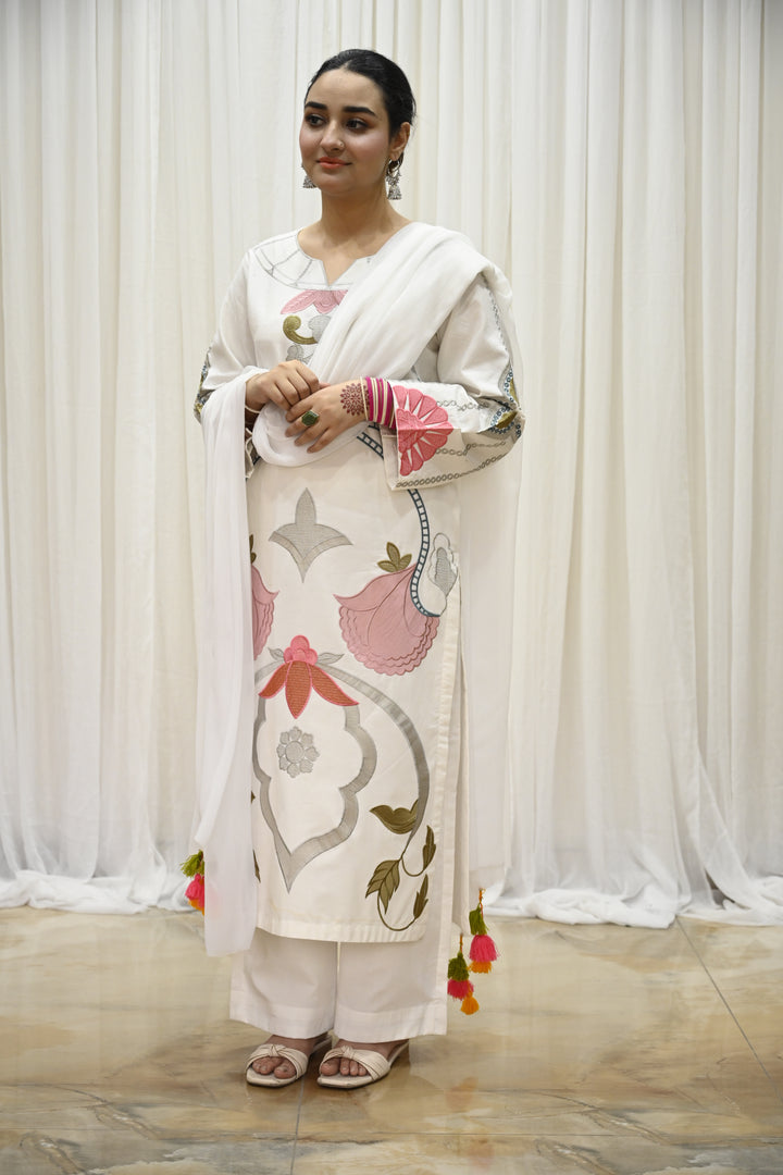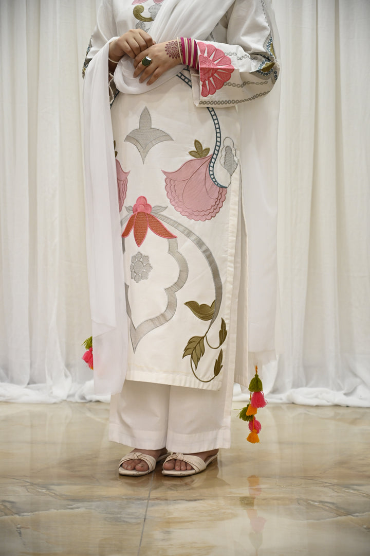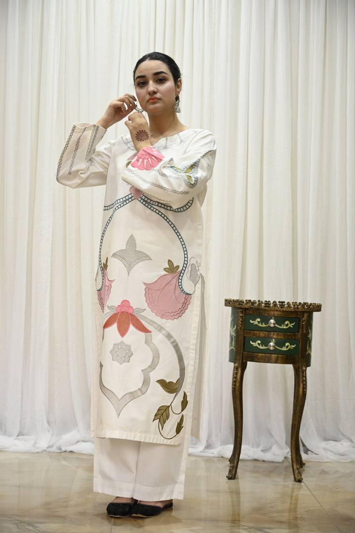 Crafted on a smooth ivory base, this outfit features delicate embroidered patterns in shades of pink, olive, grey, and soft gold. The designs are inspired by nature — soft petals, flowing vines, and subtle textures that add just the right amount of detail without overpowering the look. It’s stitched in a classic straight cut that falls beautifully, giving it a relaxed yet refined feel.