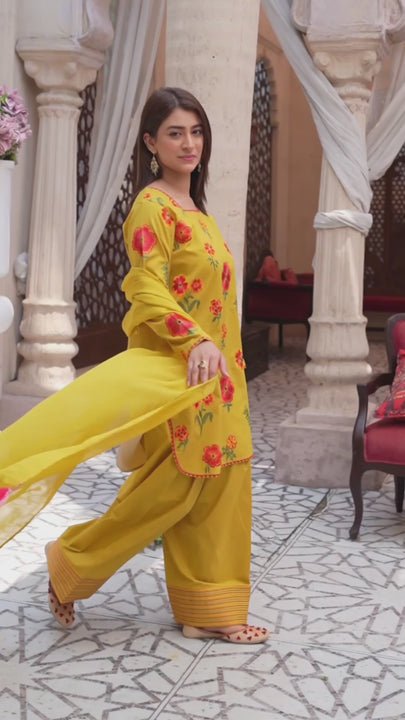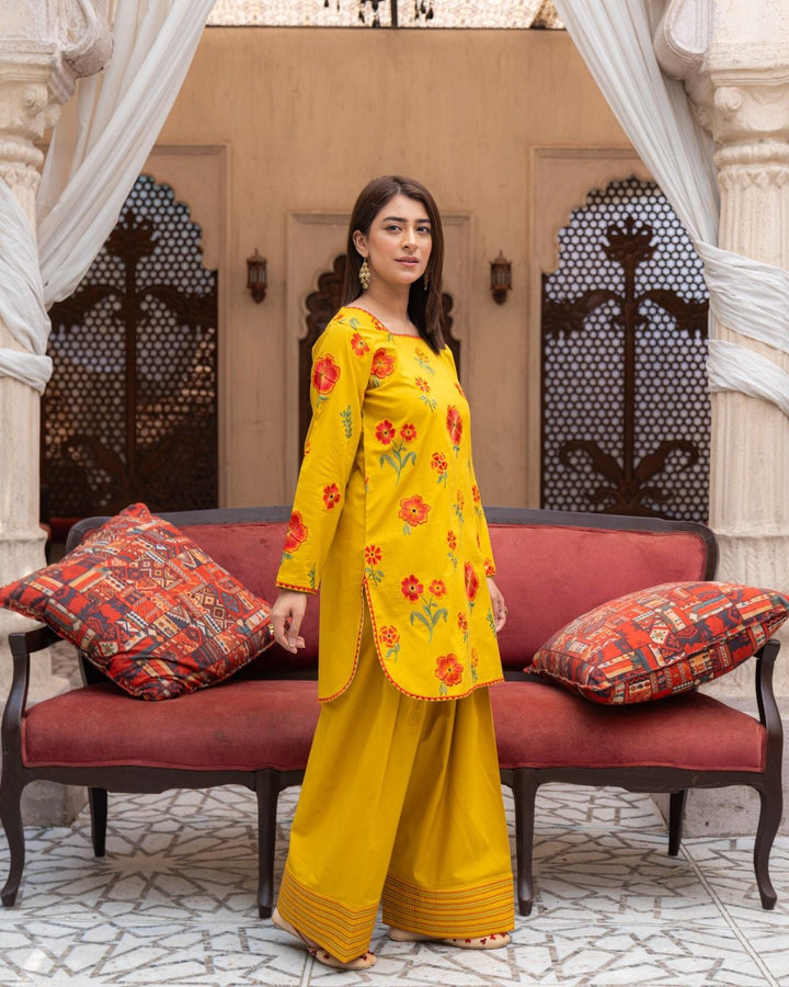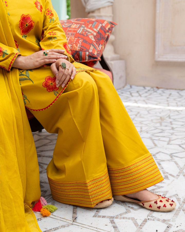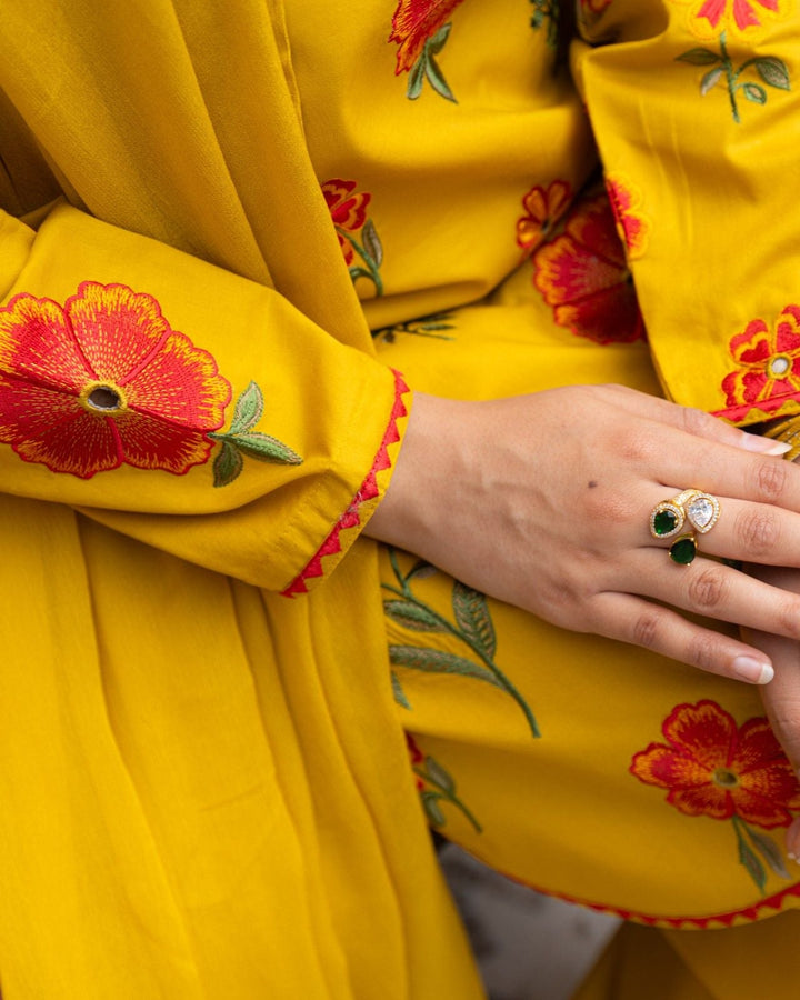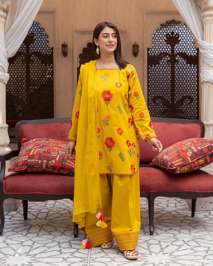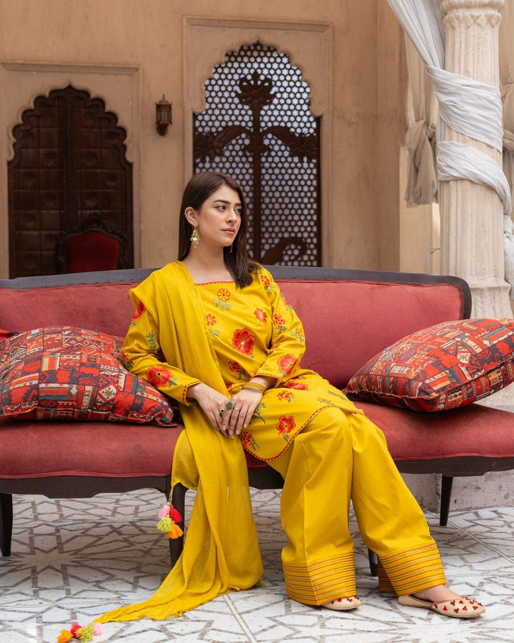 RANIYA - ZARD BAHAAR is a radiant 3-piece stitched ensemble in a rich mustard yellow, beautifully adorned with intricate red and green floral embroidery that echoes the charm of spring gardens. The kurta’s straight cut is paired with relaxed FARSHI SHALWAR detailed with classic threadwork and a breezy chiffon dupatta finished with vibrant tassels, adding a playful yet elegant touch. Ideal for daytime gatherings, festive brunches, or summer soirées, this outfit brings joy to every moment with its graceful color palette and timeless desi flair.